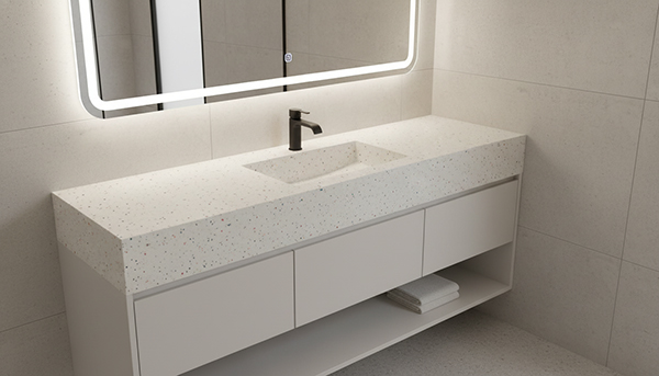 در سرویسهای بهداشتی و فضاهای بهداشتی نیز GR-163 انتخابی بینقص است. اجرای روشویی یکپارچه با این کورین، همراه با شیرآلات مشکی مات یا کروم، فضایی تمیز، روشن و مدرن خلق میکند. همچنین به دلیل طرح ظریف این کد، استفاده از لبههای ضخیم، اپنهای یکپارچه و طراحی آبشاری (Waterfall) بسیار چشمنواز خواهد بود. وجود نقاط رنگی ریز باعث میشود این کد بتواند با رنگهای پاستلی مانند سبز ملایم، آبی روشن یا صورتی کمرنگ نیز هماهنگ شود و فضایی نرم و آرام ایجاد کند. در مجموع، GR-163 یکی از آن کدهایی است که هم در فضاهای مدرن و مینیمال و هم در محیطهای خلاقانه و دوستانه میتواند بهترین عملکرد را داشته باشد.