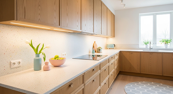 کورین اورانوس GR-163 به دلیل زمینه سفید و دانههای رنگی پراکنده، ظرفیت طراحی بسیار بالایی دارد و میتواند حالوهوای فضا را بهطور کامل تغییر دهد. یکی از بهترین ایدهها برای استفاده از این کد، خلق یک فضای مینیمال و روشن است؛ جایی که صفحه سفید و بافت ریز آن باعث میشود محیط بزرگتر، تمیزتر و روشنتر دیده شود. ترکیب این سنگ با کابینتهای سفید مات و جزئیات فلزی مشکی یا استیل، جلوهای ساده اما کاملاً حرفهای ایجاد میکند. اگر به دنبال حس گرمتر و صمیمیتری هستید، هماهنگی GR-163با چوبهای روشن مثل بلوط یا راش یک انتخاب ایدهآل است و میتواند فضا را به سبک اسکاندیناوی نزدیک کند، سبکی که ترکیب روشنایی و گرما را بهزیبایی در کنار هم قرار میدهد.