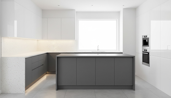 در پروژههایی که نیاز به جذابیت بصری و کنتراست دارند، میتوان از طراحی دو رنگ استفاده کرد. مثلاً اجرای صفحه کابینت با GR-163و انتخاب صفحه تیرهتر برای جزیره، یا استفاده از کابینتهای بالا سفید و کابینتهای پایین طوسی، ترکیب رنگی جذابی ایجاد میکند بدون اینکه فضا شلوغ شود. دانههای رنگی موجود در این کد باعث میشود برای فضاهای عمومی مانند کانتر کافیشاپ یا پیشخوان فروشگاهها نیز گزینهای عالی باشد؛ زیرا حس انرژی و پویایی را به محیط منتقل میکند. اگر طراحی با نور مخفی یا فرمهای منحنی نیز در فضا بهکار رود، جلوه این سنگ دوچندان خواهد شد.