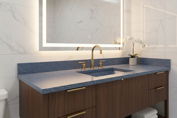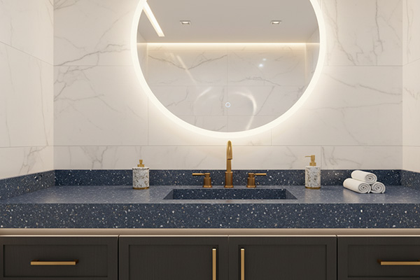 در فضاهای لوکستر میتوان از GR-236در کنار فلزات طلایی، نیکل مشکی یا برنز استفاده کرد. مثلاً در سرویس بهداشتی، روشویی از این سنگ ساخته شود و آینه با فریم طلایی یا چراغهای دیواری برنجی کنار آن قرار گیرد. این ترکیب باعث میشود رنگ سرد آبی سنگ با گرمای فلزات متعادل شده و نتیجه فضایی رسمی، شیک و چشمگیر باشد. اگر سطح را نیمه براق یا براق انتخاب کنید، انعکاس جزئی نور روی ذرات ریز داخل سنگ، حالتی درخشان و بسیار ظریف ایجاد میکند.