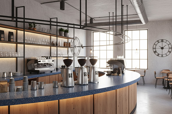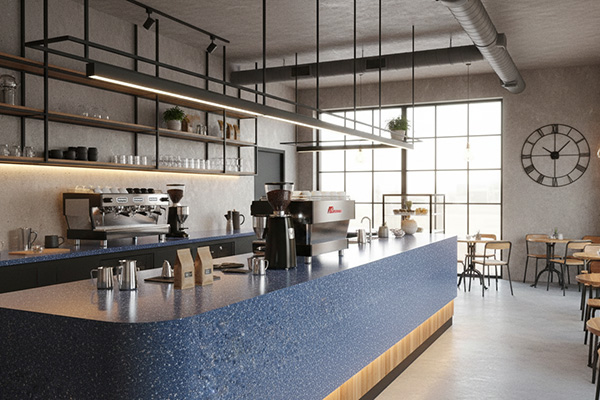 کانتر کافی شاپ یا رستوران: بافت دانه ای، فضا را از یکنواختی خارج می کند و حس حرفه ای و تمیز ایجاد می کند.
