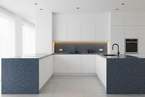 یکی از ایدههای بسیار جذاب برای طراحی با سنگ کورین GR-236 استفاده از آن بهعنوان صفحه ای شاخص در کنار متریال های گرم و طبیعی است. رنگ آبی متمایل به خاکستری این کد حالتی آرام، حرفه ای و کمی لوکس ایجاد می کند و اگر آن را با کابینت های چوبی روشن مانند بلوط یا راش ترکیب کنید، یک تضاد کنترلشده و چشم نواز به دست می آید. این تضاد باعث میشود بافت دانه ای سنگ بیشتر دیده شود و فضا از نظر بصری عمق پیدا کند. همچنین استفاده از نورپردازی خطی در زیر کابینتهای بالایی، ذرات سفید و کرم داخل سنگ را برجستهتر کرده و جلوهای زنده و پویا به صفحه میدهد.