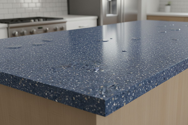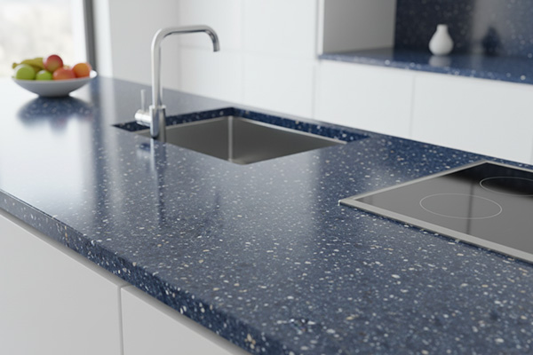 رنگ و طرح: رنگ غالب در این کد، آبی اقیانوسی است، رنگی که نه بیش از حد سرد و صنعتی است و نه حالت کلاسیک خشک دارد. ذرات ریز و درشت سفید، کرم و قهوه ای که در بافت سنگ پراکنده شدهاند، عمق بصری خاصی ایجاد می کنند و موجب می شوند سطح کورین از حالت تخت و ساده خارج شود. این بافت چندلایه ای، حس سنگ طبیعی را تقویت می کند و در عین حال، نظم ظریفی در پاشیدگی ذرات مشاهده می شود که نشاندهنده اصالت طراحی و کیفیت تولید است.