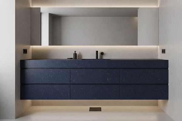 روشویی سرویس بهداشتی: رنگ تیره همراه با دانه های روشن، حس تمیزی و عمق را القا کرده و برای سرویس های مستر یا هتل ها بسیار مناسب است.