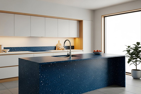 از نظر ترکیب رنگی، GR-238 در کنار رنگ های روشن بهترین عملکرد را دارد. استفاده از سفید گرم، شیری یا طوسی روشن برای کابینت ها، بدنه ها یا دیوارهای اطراف، تیرگی سنگ را متعادل کرده و مانع از بسته شدن فضا می شود. ترکیب این کد با چوب طبیعی روشن مانند بلوط یا راش نیز انتخابی بسیار موفق است، زیرا گرمای چوب تضاد دلنشینی با سردی آبی سنگ ایجاد می کند و فضا را زنده تر و صمیمی نشان می دهد. در پروژه های لوکس تر می توان از جزئیات فلزی طلایی مات، برنزی یا استیل تیره برای افزایش حس کیفیت و ظرافت استفاده کرد.