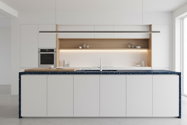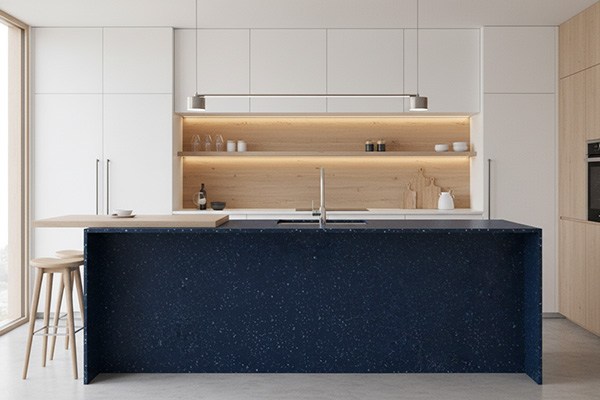 رنگ ها و متریال های مکمل: ترکیب با چوب طبیعی روشن یا متوسط (مانند بلوط یا راش) برای ایجاد تعادل بین سردی رنگ و گرمای فضا. استفاده از کابینتهای سفید، طوسی روشن یا خاکستری گرم برای برجستهتر شدن عمق رنگ آبی.
