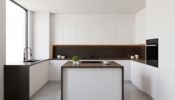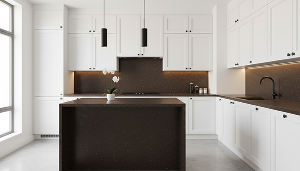 برای طراحی با سنگ کورین اورانوس GR-300 بهتر است از ایدههایی استفاده شود که عمق رنگ قهوه ای تیره و دانه بندی شاخص آن را بهعنوان نقطه قوت فضا برجسته کند. یکی از ایده های مؤثر، استفاده از این کد به عنوان المان شاخص است. مثلاً صفحه کابینت جزیره یا کانتر اصلی آشپزخانه که در کنار کابینت های روشن یا چوبی، به مرکز توجه فضا تبدیل می شود. این رویکرد باعث می شود سنگ نقش هویتی داشته باشد و فضا از یکنواختی خارج شود.