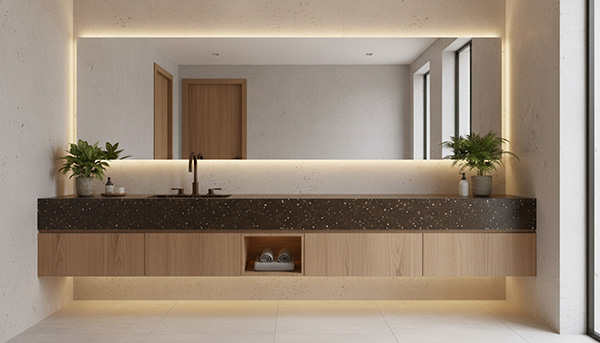 در طراحی سرویسهای بهداشتی مدرن، ایده استفاده از این سنگ برای روشویی یکپارچه با لگن ساختهشده از خود کورین بسیار کاربردی است. رنگ تیره GR-300 در کنار دیوارهای روشن، بتن اکسپوز یا سرامیک های خنثی، کنتراست چشم نوازی ایجاد می کند و فضا را شبیه به حمام های هتل های لوکس می سازد. استفاده از شیرآلات مشکی مات یا برنزی در این فضا، هماهنگی بصری بسیار بالایی با این کد ایجاد میکند.