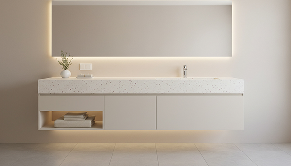 روشویی یکپارچه مینیمال با بک اسپلش همرنگ: در سرویس بهداشتی، استفاده از GR-321 برای روشویی یکپارچه (Integrated Sink) همراه با بک اسپلش همجنس، حس تمیزی و انسجام را تقویت می کند. ترکیب این سنگ با دیوارهای کرم روشن، طوسی گرم یا حتی میکروسمنت روشن، فضایی آرام و لوکس می سازد. این ایده به خصوص برای سرویس های مستر یا سرویس مهمان بسیار مناسب است.
