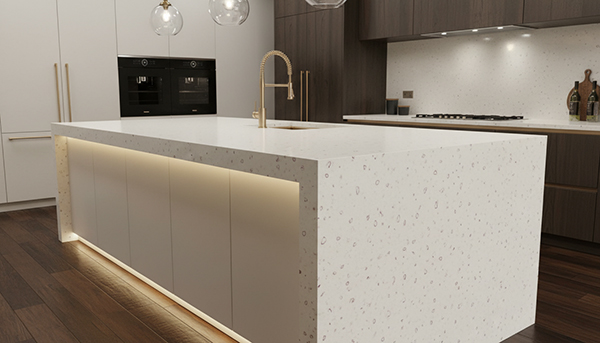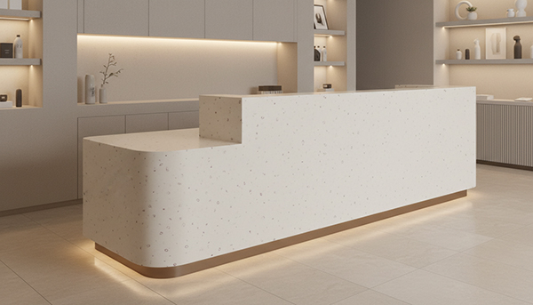 کانتر فروشگاه یا کلینیک با خطوط ساده: برای فضاهای تجاری، اجرای پیشخوان با طراحی ساده و خطوط صاف، اجازه می دهد کیفیت متریال دیده شود. در این فضاها حس اعتماد، بهداشت و حرفه ایبودن را منتقل می کند. پیشنهاد می شود لوگو یا نام برند با نور مخفی یا حروف برجسته روی بدنه ای با رنگ خنثی نصب شود تا تمرکز بصری روی کانتر حفظ شود.