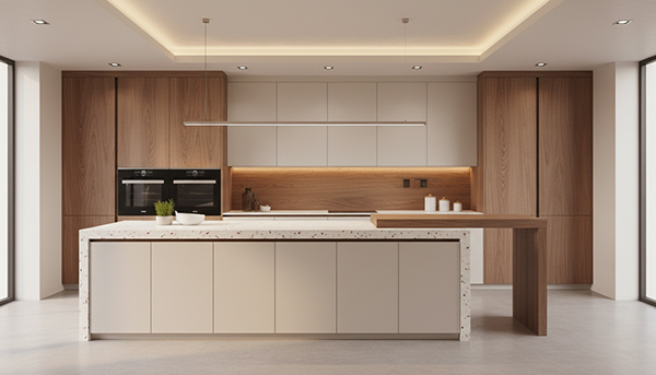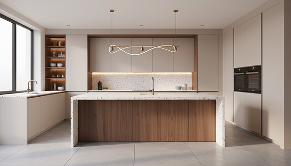 آشپزخانه گرم و مدرن با تاکید بر تضاد ملایم: استفاده از GR-321 به عنوان صفحه کابینت اصلی در کنار کابینت های سفید گرم، شیری یا بژ روشن، فضایی بسیار متعادل ایجاد می کند. دانه های عنابی نقش نقطه ی کانونی را بازی می کنند و مانع یکنواختی فضا می شوند. برای تکمیل طراحی، استفاده از دستگیره های فلزی برنز یا طلایی مات و شیرآلات با رنگ شامپاینی، حس لوکس اما غیرنمایشی به آشپزخانه می دهد.
